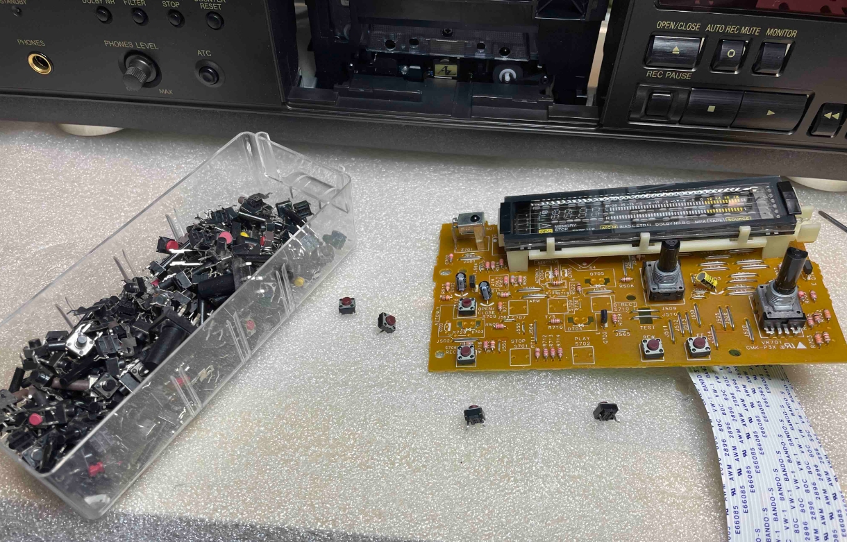 Při testování jednotlivých funkcí byly zjištěny nepravidelné výpadky tlačítek STOP, PLAY a MONITOR, proto byly vyměněny mikrospínače na čelní desce.