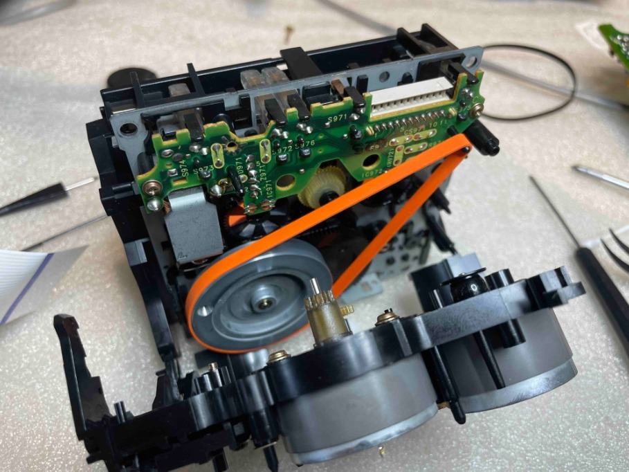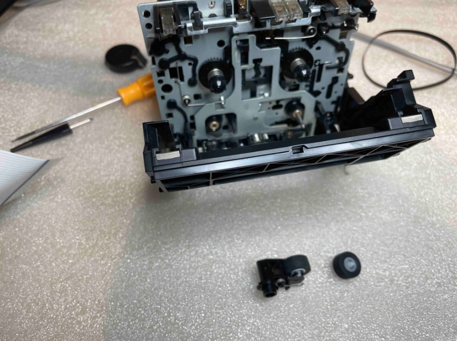 Ozubená kola Loading Gear a Reel Motor byla vyměněna, ostatní byla důkladně vyčištěna a ošetřena speciální pastou určenou pro plastové převody, aby byl zajištěn plynulý a tichý chod mechaniky. Přítlačná kladka byla nahrazena novou, což je u těchto modelů zásadní krok pro obnovení správného vedení pásku a stability otáček.